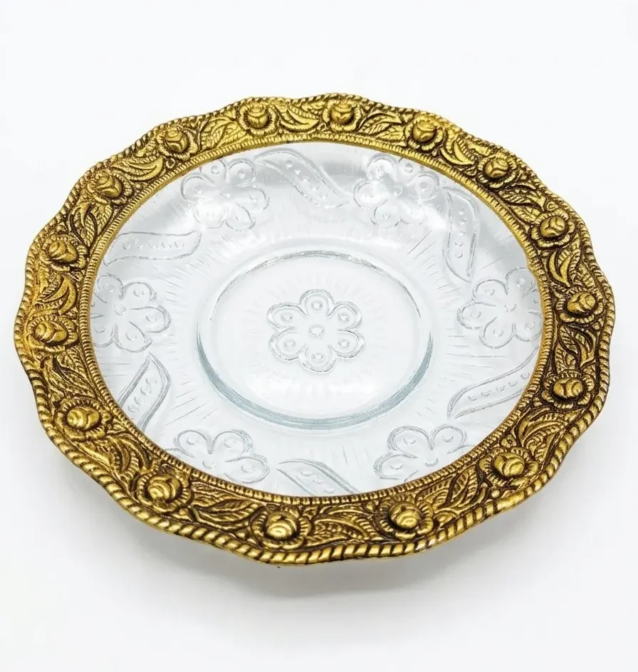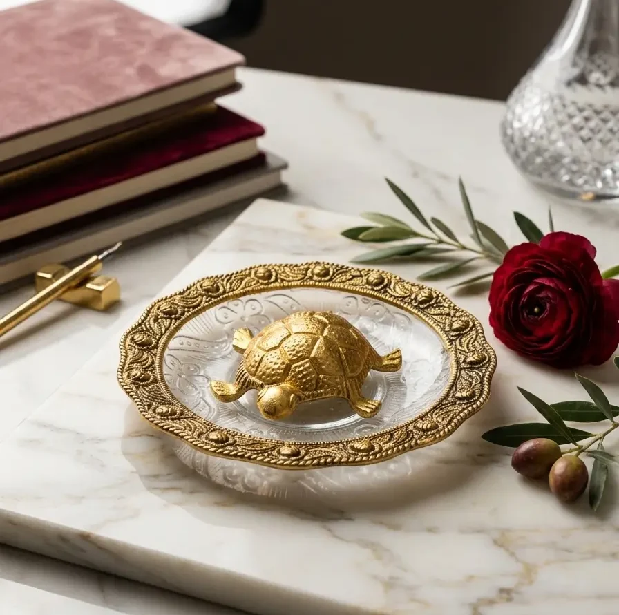 2. Decorative Embossed Glass Plate: Accompanying the metal tortoise is a premium, thick-walled glass plate. The plate is adorned with a stunning gold-tinted rim featuring floral and vine motifs. The base of the glass is textured to catch the light, creating a shimmering effect when filled with water—a crucial element for activating the tortoise’s Vastu benefits.