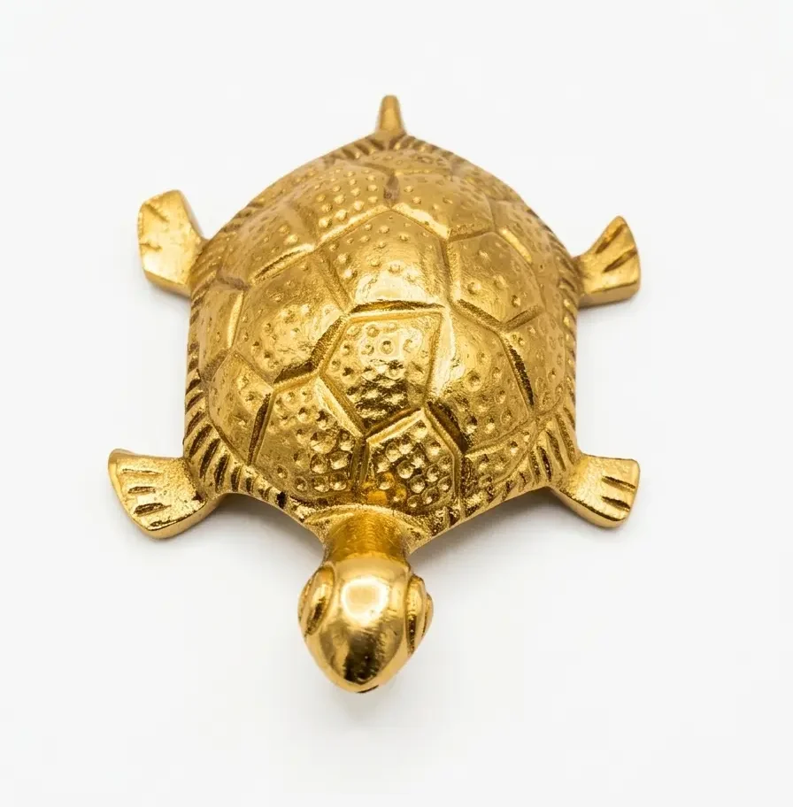 1. High-Quality Brass Metal Construction: The tortoise is meticulously cast from high-grade brass metal, finished with a lustrous golden polish that mimics the radiance of pure gold. The shell features intricate geometric patterns and “dots” that are traditional to Vedic symbolism, representing the various constellations and the stability of the earth.