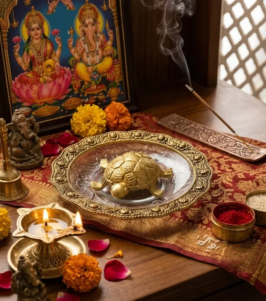 1. The Water Element: Always place the brass tortoise inside the glass plate. Fill the plate with a small amount of fresh water so that the feet of the tortoise are submerged. You may also add a few fresh flower petals (marigold or rose) to enhance the aesthetic and spiritual vibration.