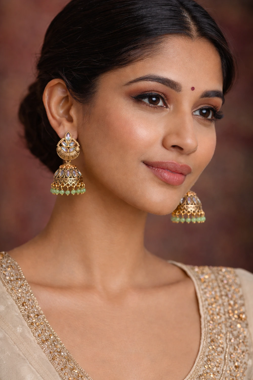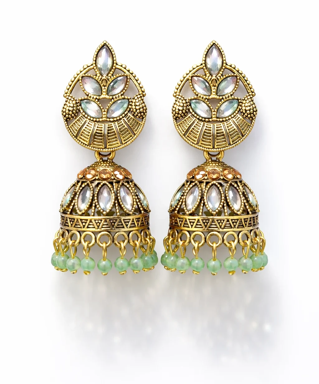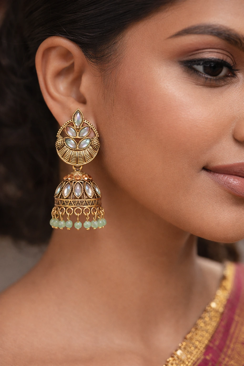 Add timeless elegance to your look with these antique gold jhumka earrings featuring sparkling iridescent stones and delicate green bead drops. Designed with intricate detailing and a classic bell silhouette, they are perfect for weddings, festive occasions, and traditional outfits. Lightweight, graceful, and effortlessly statement-making.