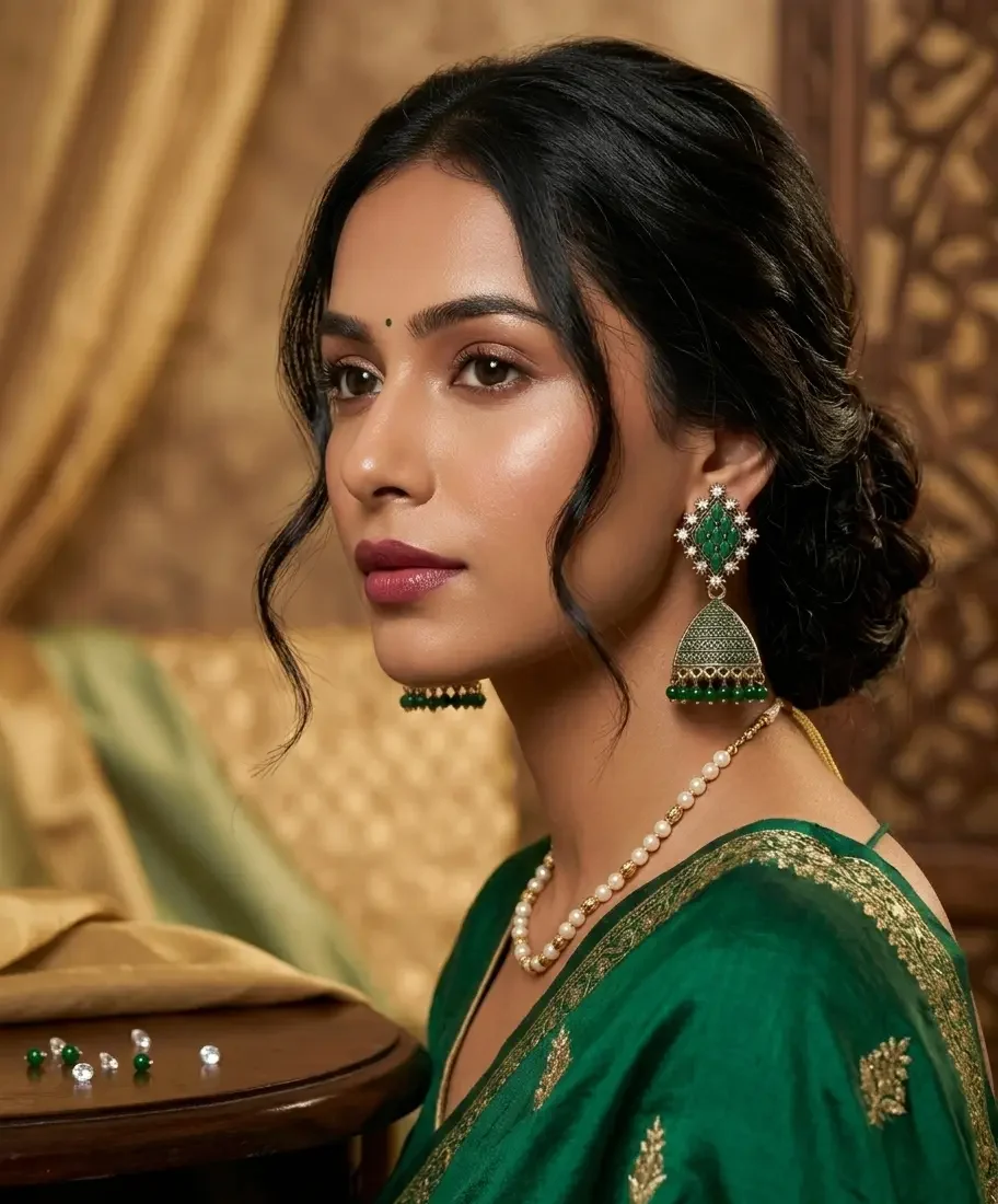 Elevate your jewelry collection with our Emerald Green Meenakari Jhumka Earrings, a masterpiece of traditional Indian artistry designed for the modern woman. These earrings are more than just an accessory; they are a statement of grace, culture, and impeccable style. Featuring an intricate diamond-shaped stud encrusted with marquise-cut emerald green stones and shimmering crystals, they transition seamlessly from high-profile festive events to intimate family gatherings.