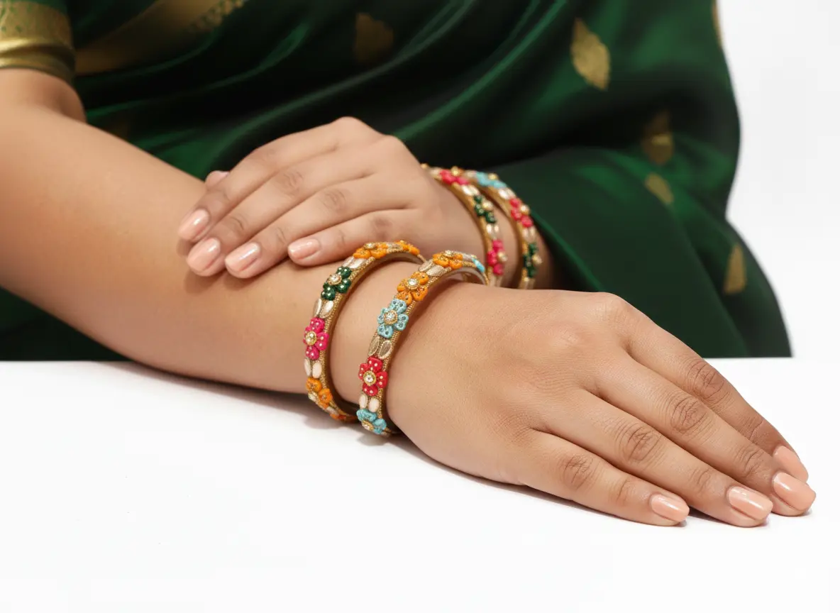 To achieve a “Chooda” inspired look, pair these colorful bangles with wide gold kadas (heavy bracelets) on either end. This will frame the floral patterns and create a more formal, high-impact jewelry statement.