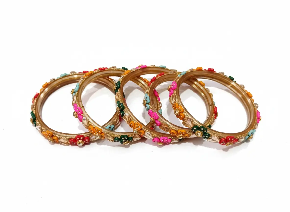 Elevate your ethnic wardrobe with this stunning set of five handcrafted gold-toned bangles. Each piece is intricately adorned with vibrant 3D floral motifs in magenta, turquoise, and orange, centered with shimmering stones for a touch of radiance. Perfect for weddings or festive celebrations, these versatile bangles add a playful yet traditional charm to any outfit.