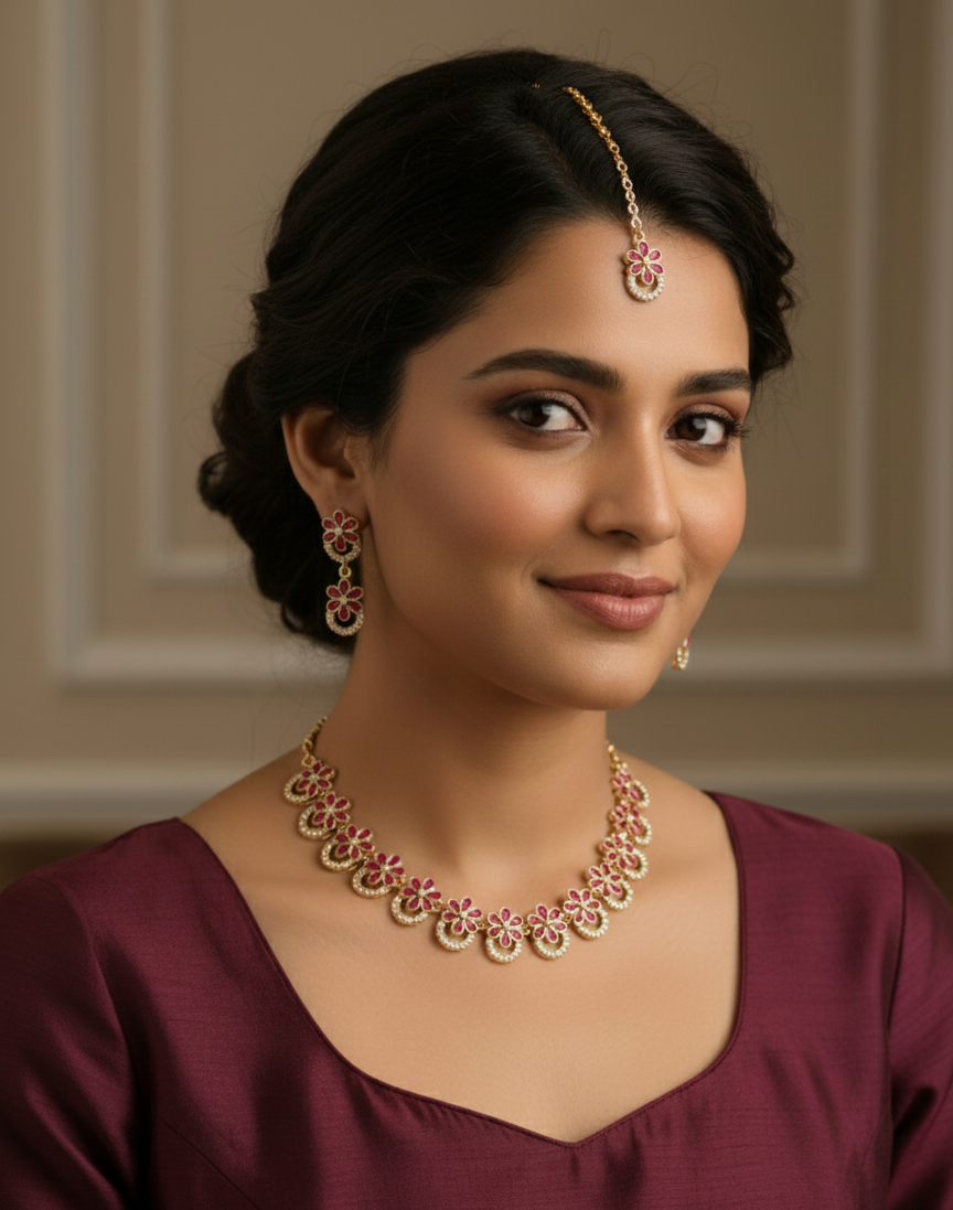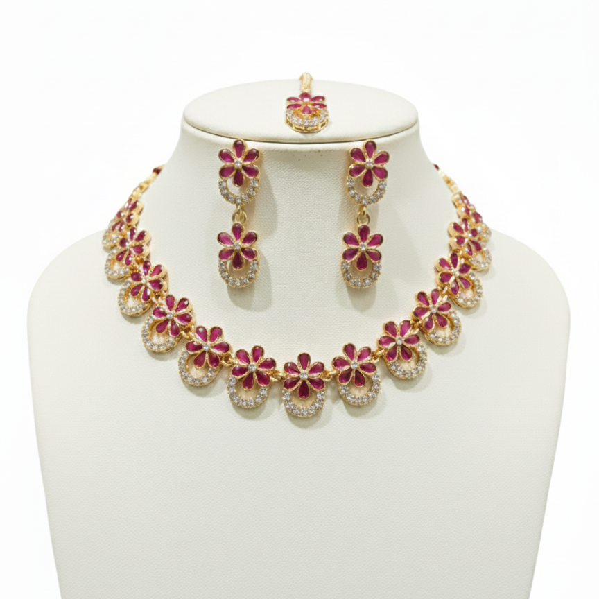 This elegant set features a vibrant ruby-pink floral motif accented by gold-tone scalloped frames and shimmering white zircons. It offers a complete traditional look, including a choker necklace, matching drop earrings, and a coordinated maang tikka.