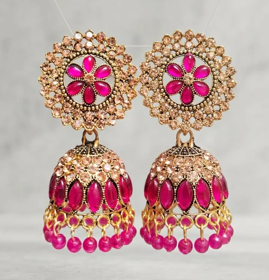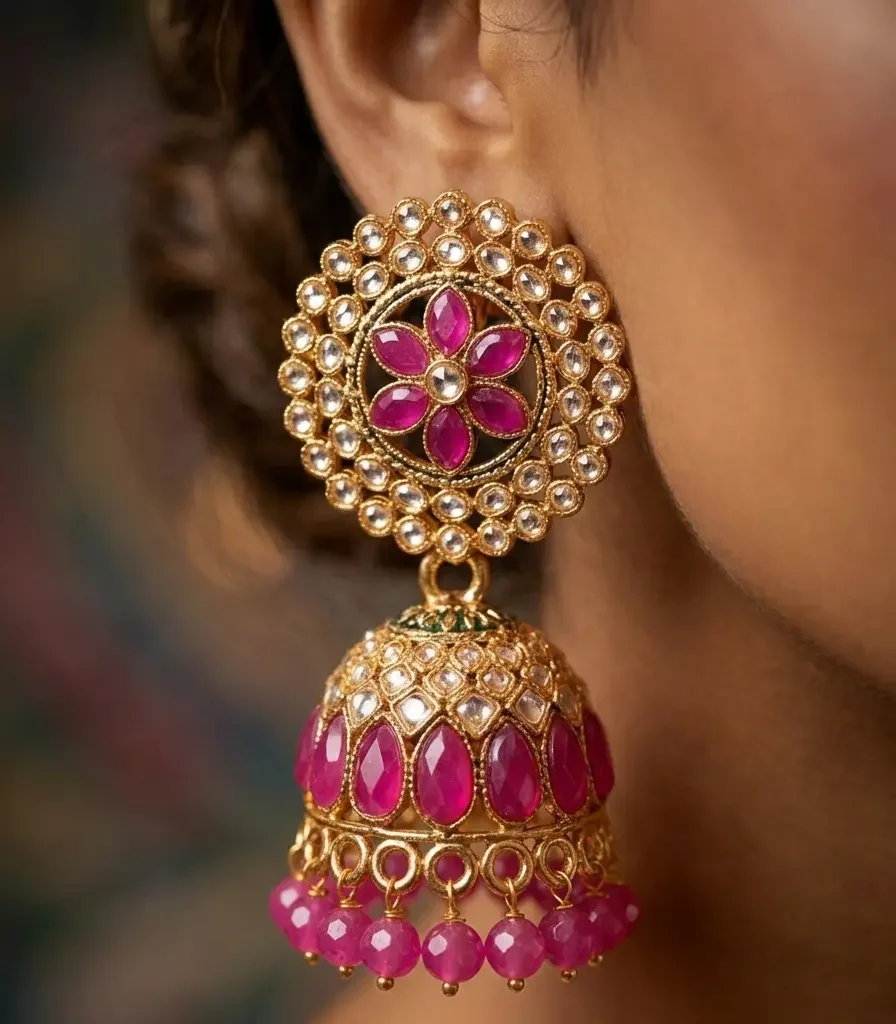 • The Finishing Touch: The base of the jhumka is lined with a row of delicate, high-shine pink beads that add a playful movement and a touch of traditional “Jhumki” charm.