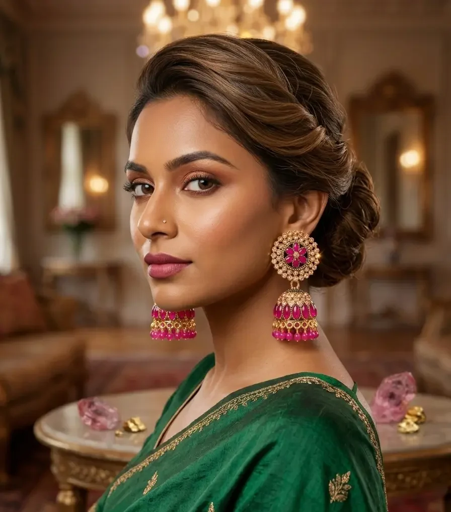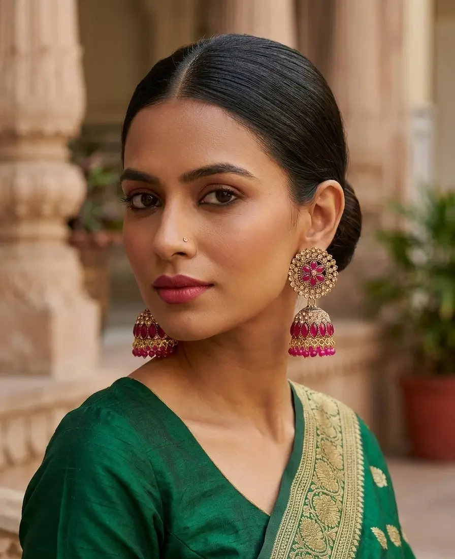 As seen on our featured Indian models, these earrings provide a striking contrast when paired with deep-colored ethnic wear. The emerald green Banarasi silk saree creates a perfect backdrop, allowing the magenta-pink hues and the antique gold finish to truly pop.
