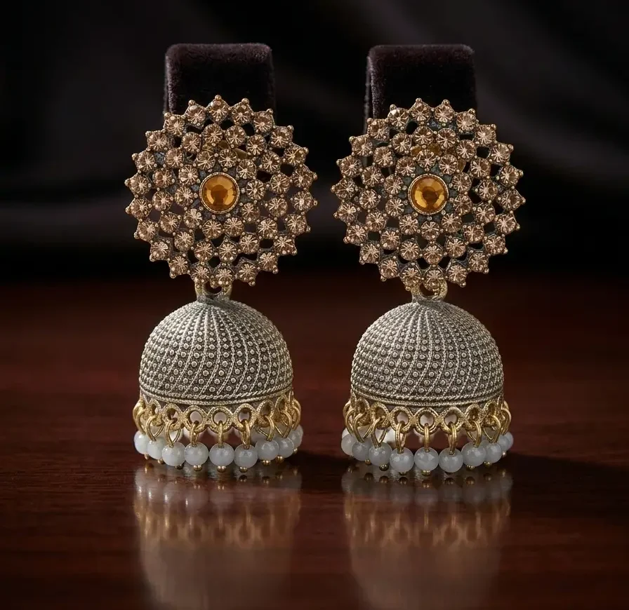 Capturing the timeless charm of vintage Indian jewelry, these Jhumkas feature a dual-tone finish that pairs beautifully with a variety of outfits. The oversized floral studs are encrusted with high-quality champagne-toned rhinestones, leading down to a classic bell-shaped Jhumka adorned with pristine white micro-beads.