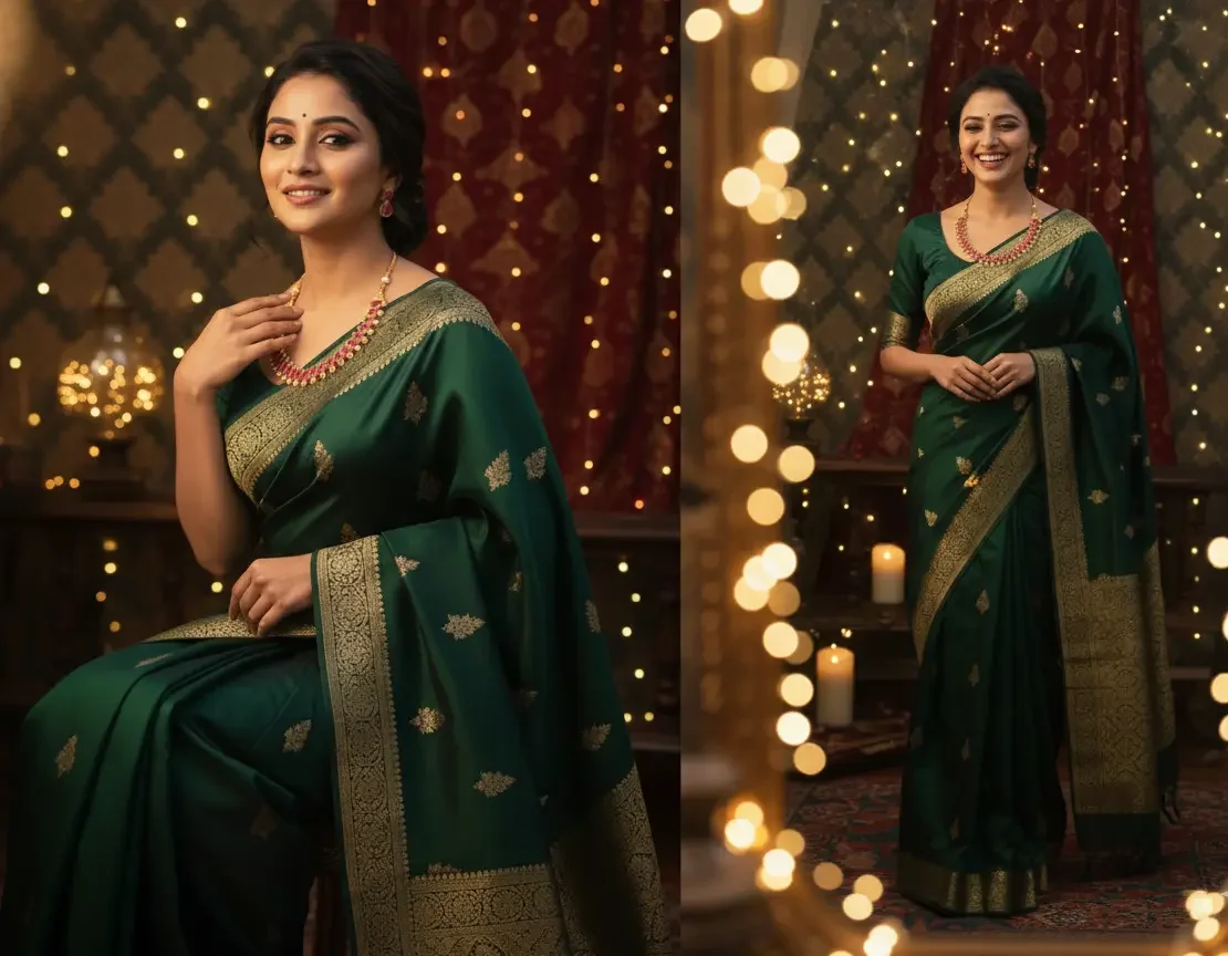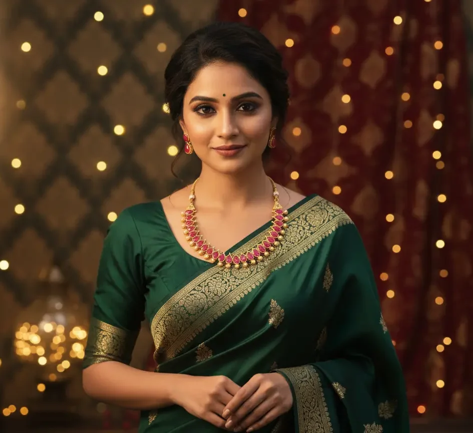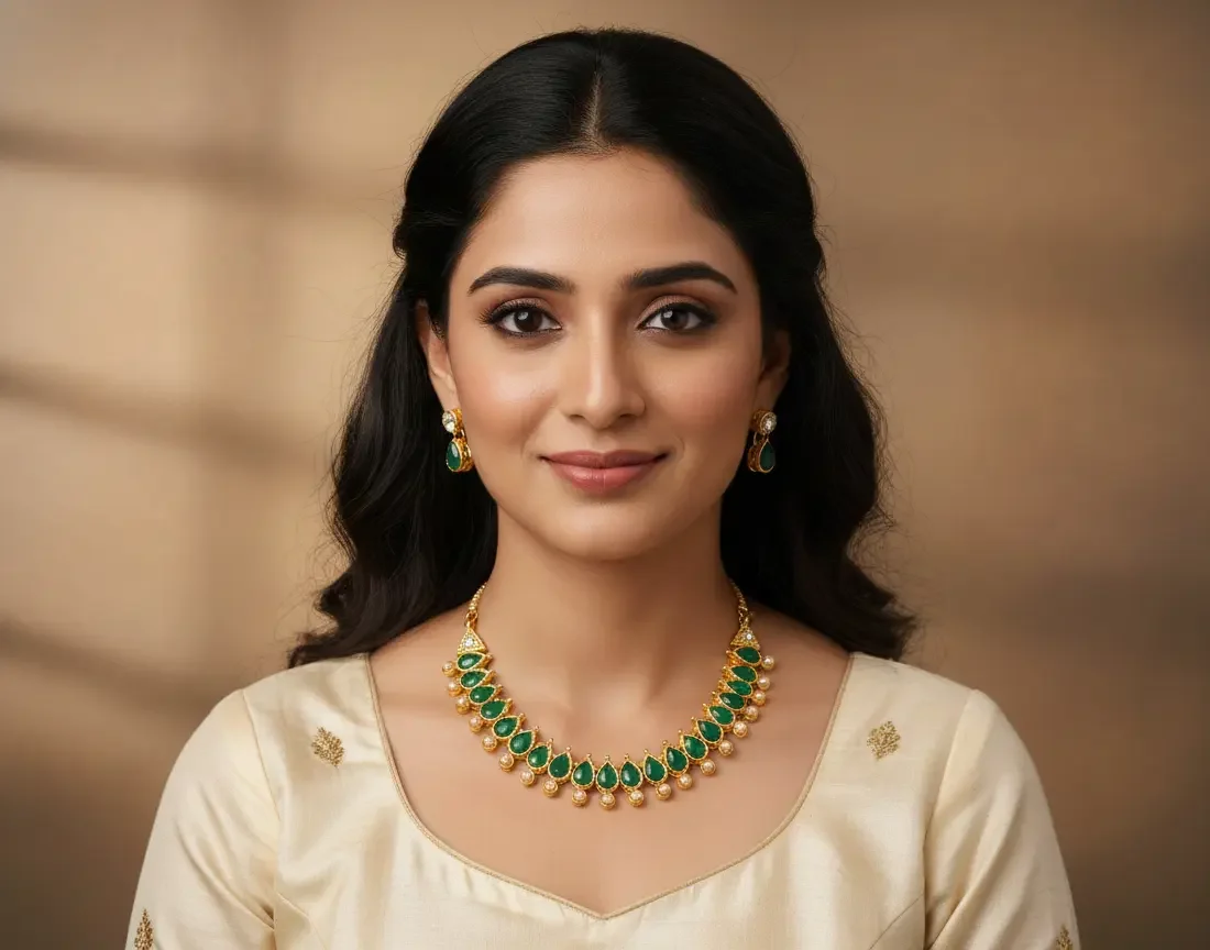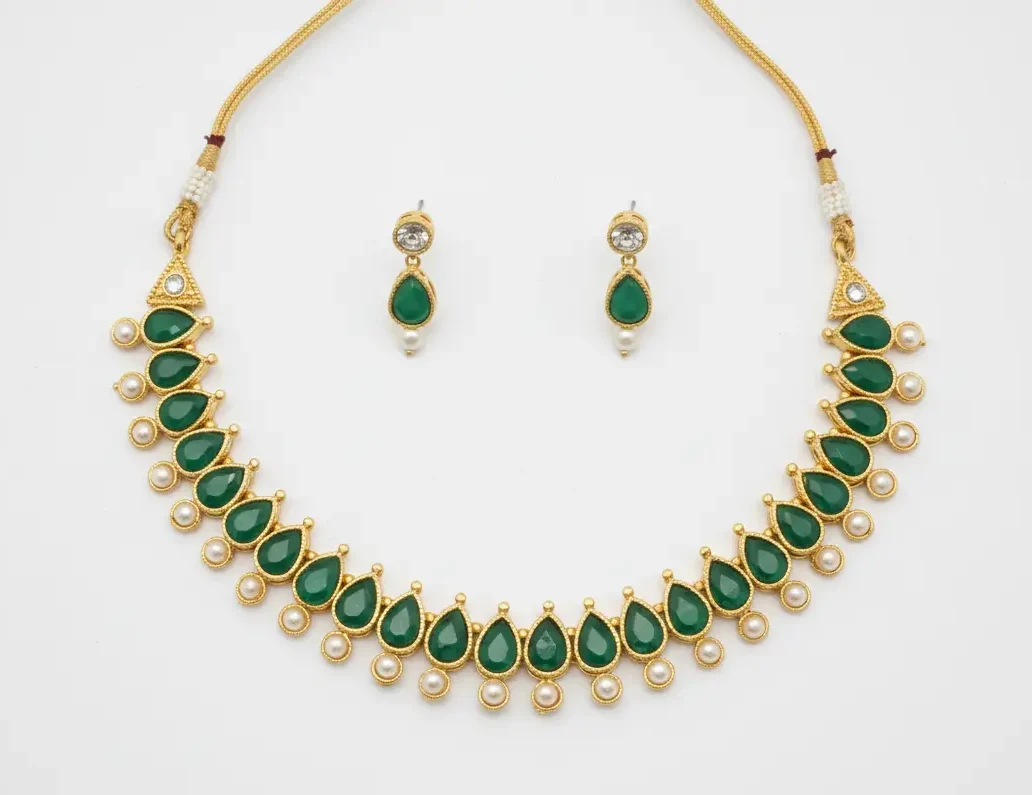 This set is the perfect companion for festive sarees, lehengas, or anarkalis. For a modern twist, pair the necklace alone with a crisp white button-down shirt or a deep V-neck evening gown to let the emerald green be the focal point of your look.