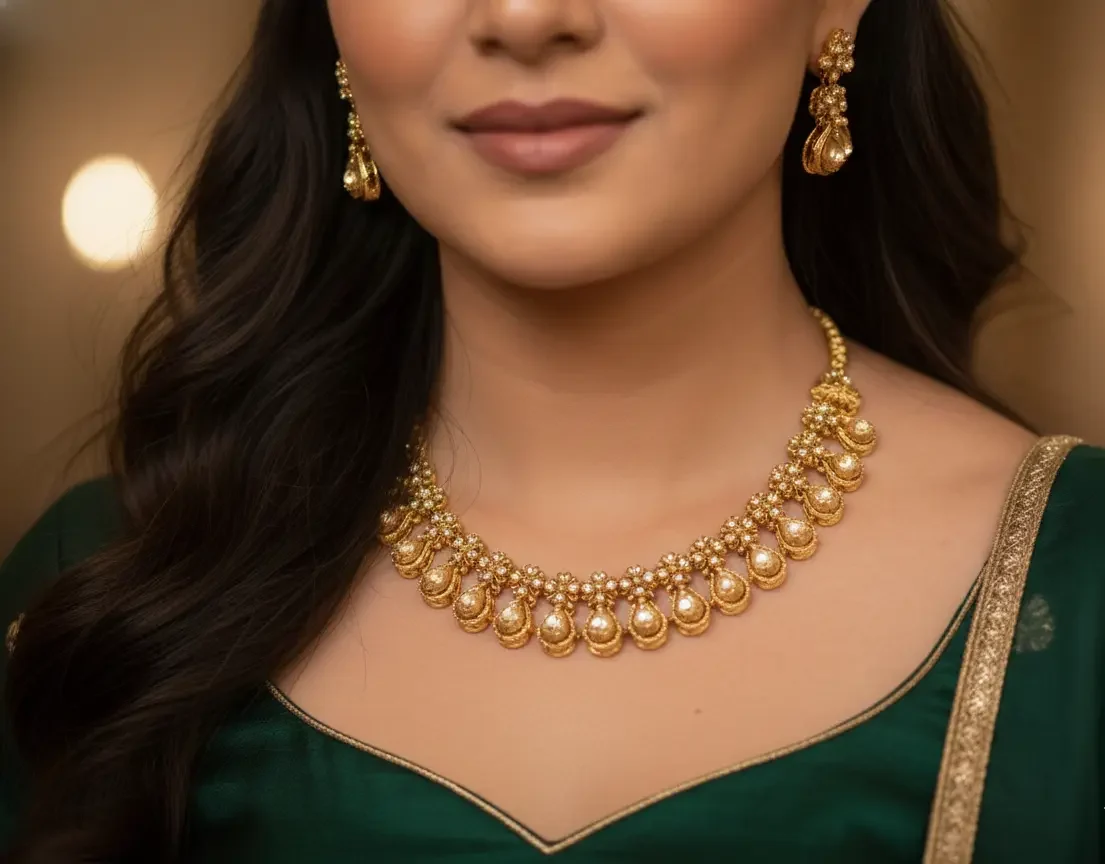 Complete Look: Includes a pair of matching teardrop earrings that mirror the necklace’s design, ensuring a perfectly coordinated aesthetic.