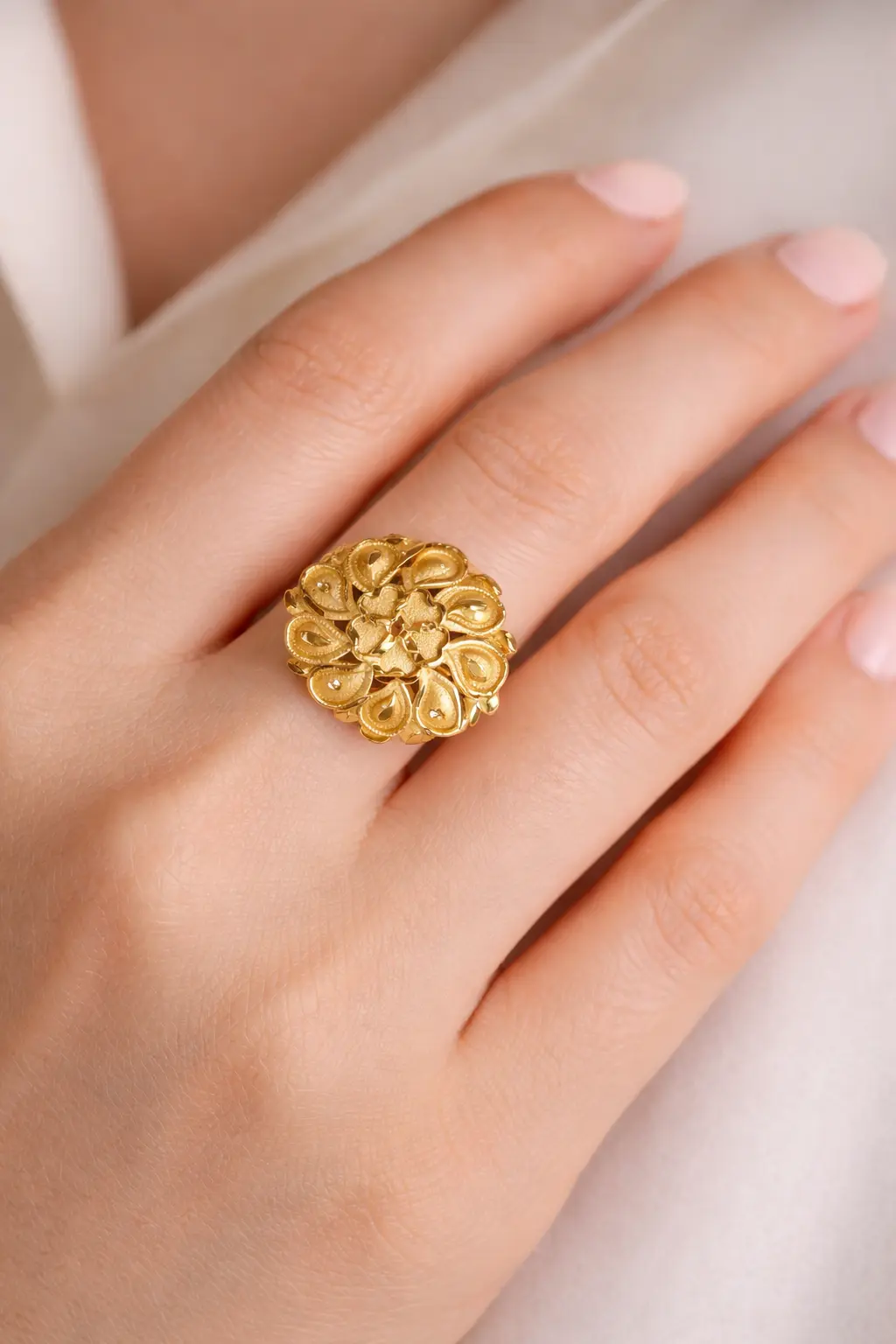 Crafted in 1 gram gold, this piece offers the rich, luminous appeal of gold in a lightweight and accessible form. The detailed filigree work highlights fine texturing along each petal, enhanced by delicate bead accents that create depth and dimension. The central floral cluster anchors the design, giving the ring a regal, heritage-inspired aesthetic reminiscent of classic Indian craftsmanship.