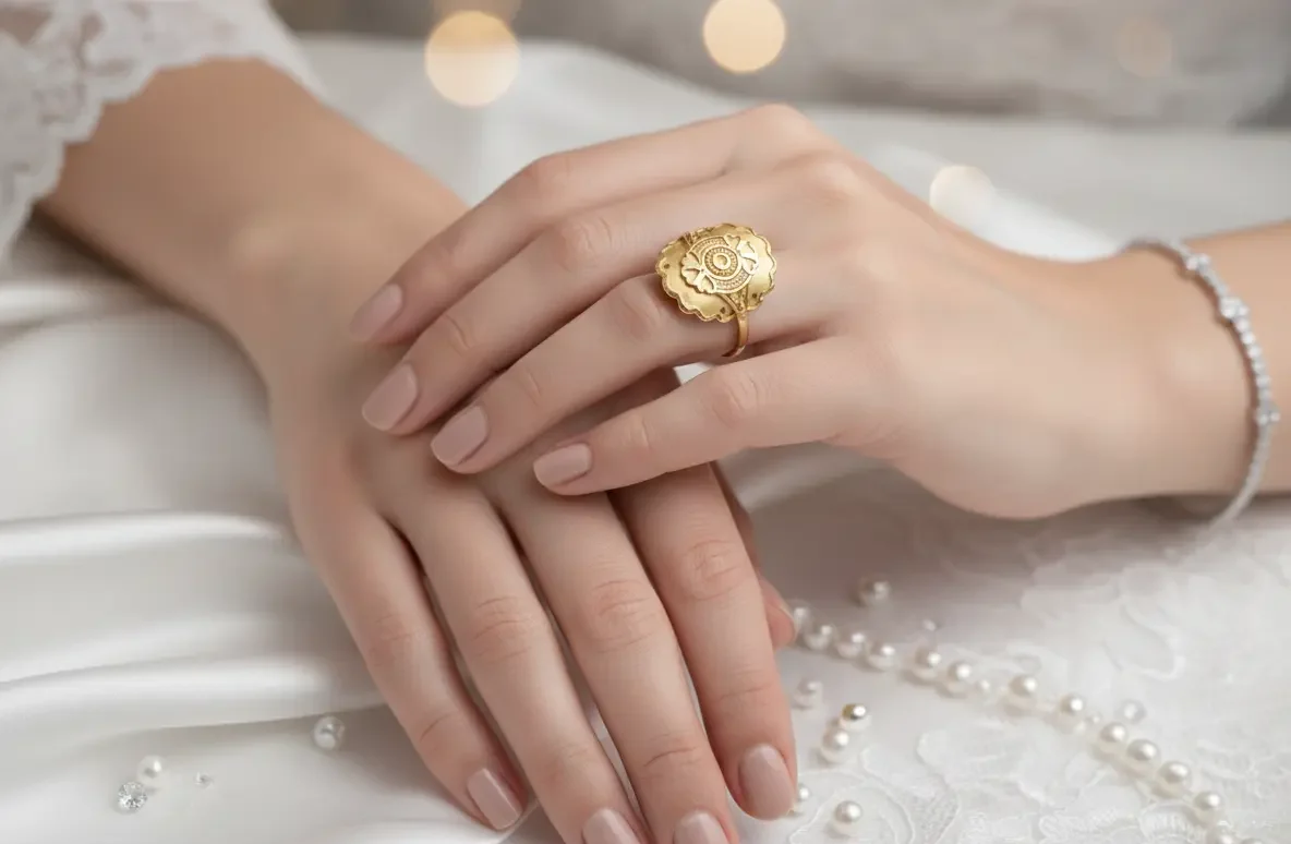 Band Style: A sleek, minimalist gold shank that tapers perfectly to ensure the large decorative face remains the undisputed star of the show.